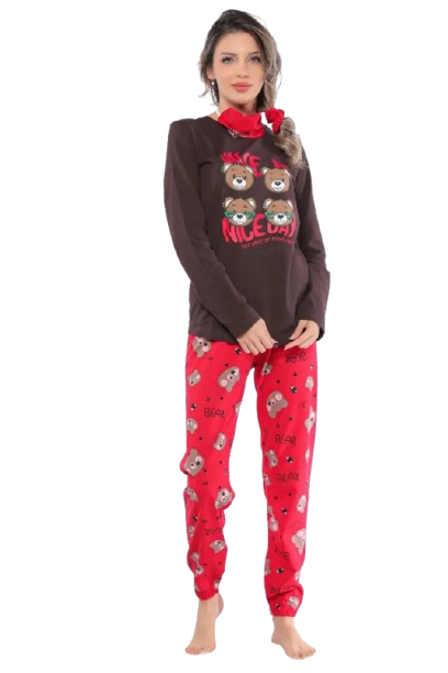 Ayıcık desenli kadın pijama takımı, kırmızı ve kahverengi renk kombinasyonu ile hem sıcak hem de dikkat çekici bir görünüm sunar. Uzun kollu yapısı sayesinde serin ve soğuk havalarda ideal kullanım sağlar.