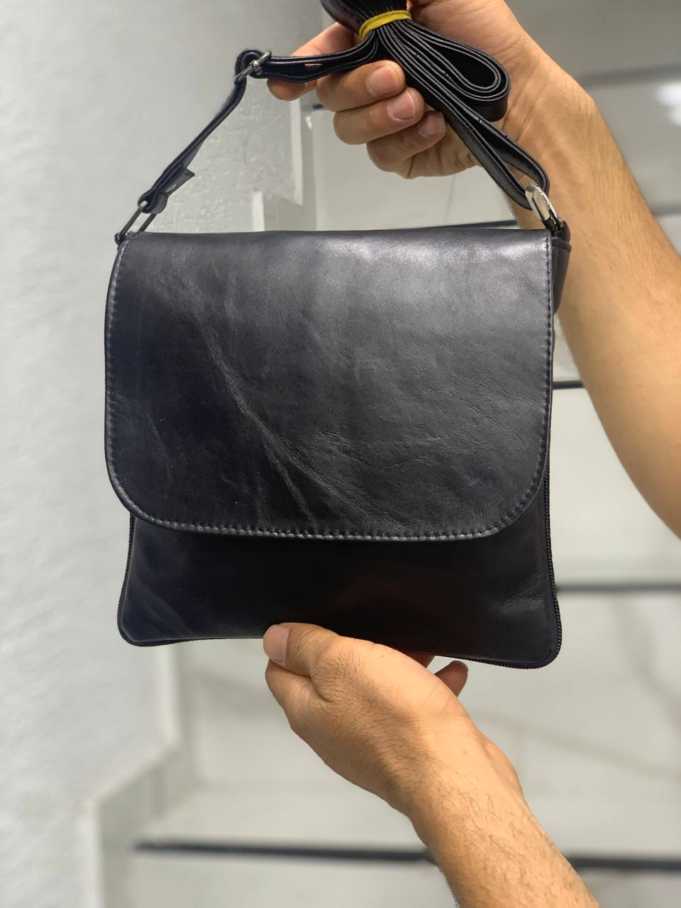 Hakiki deri erkek omuz çantası, kapaklı tasarımı ile daha şık ve klasik bir görünüm sunar. Siyah rengi ile her kombinle uyum sağlayan zamansız bir parçadır.