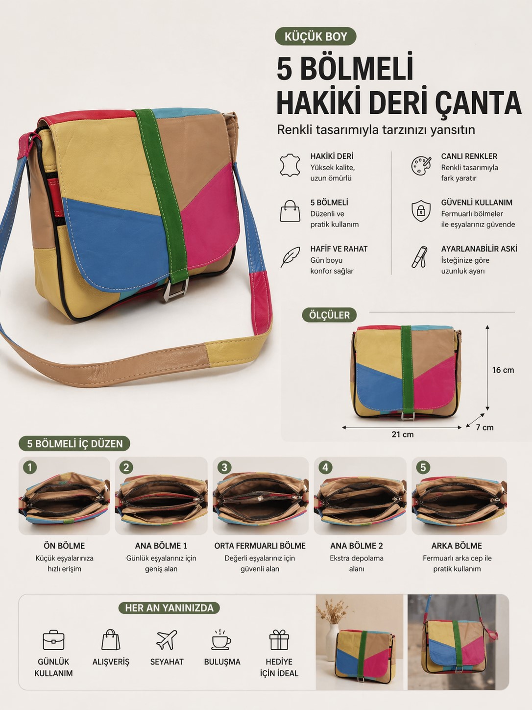 Hakiki deri yapısı sayesinde dayanıklı ve uzun ömürlü kullanım sunarken, çapraz askı detayı ile günlük kullanımda rahatlık sağlar.