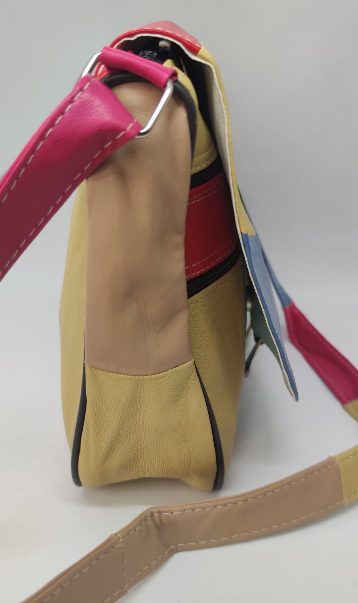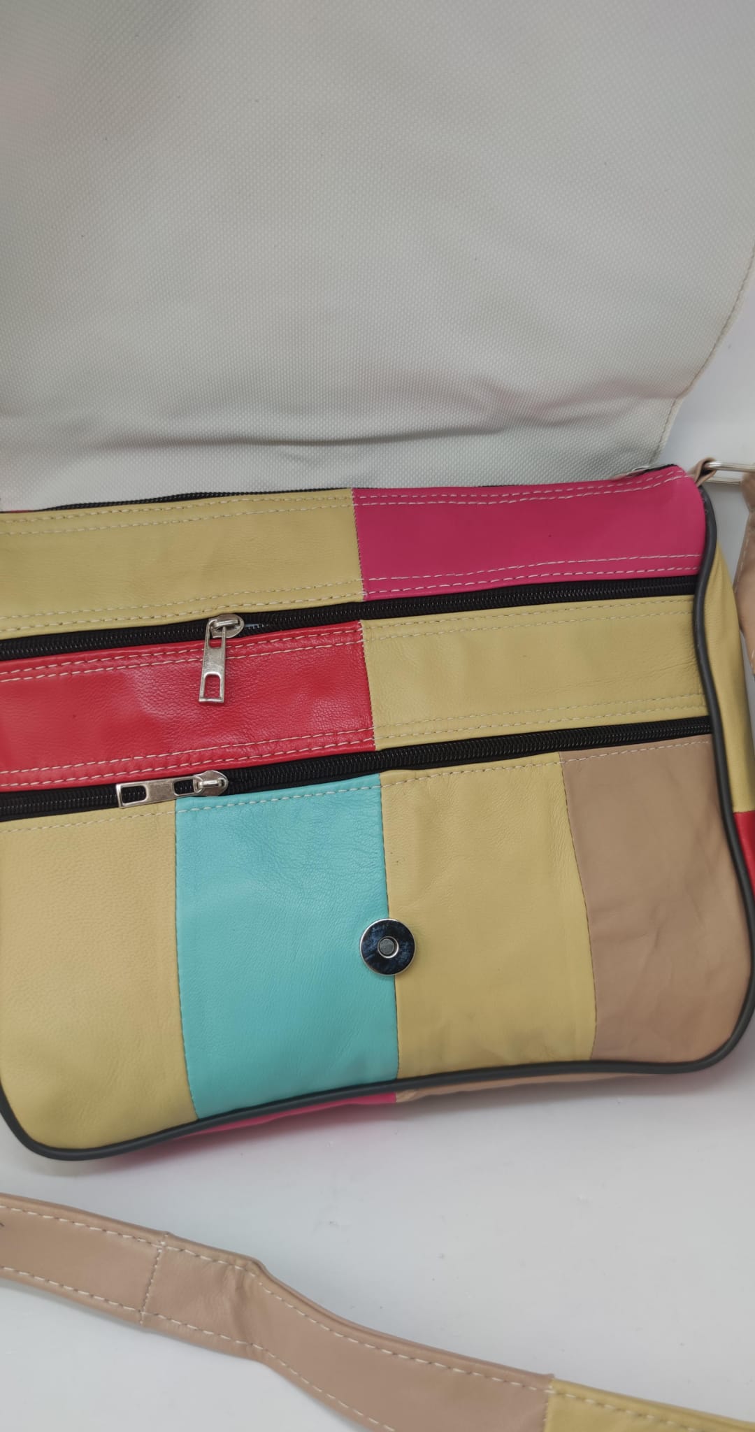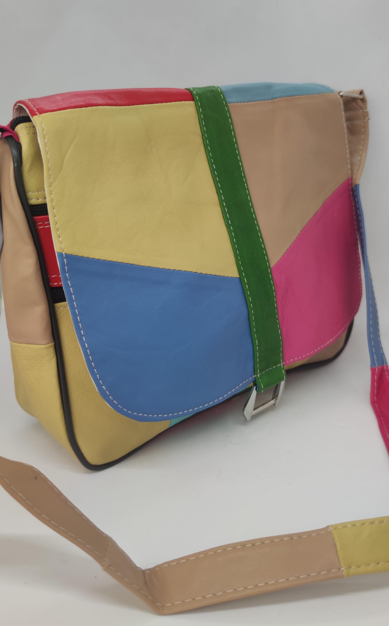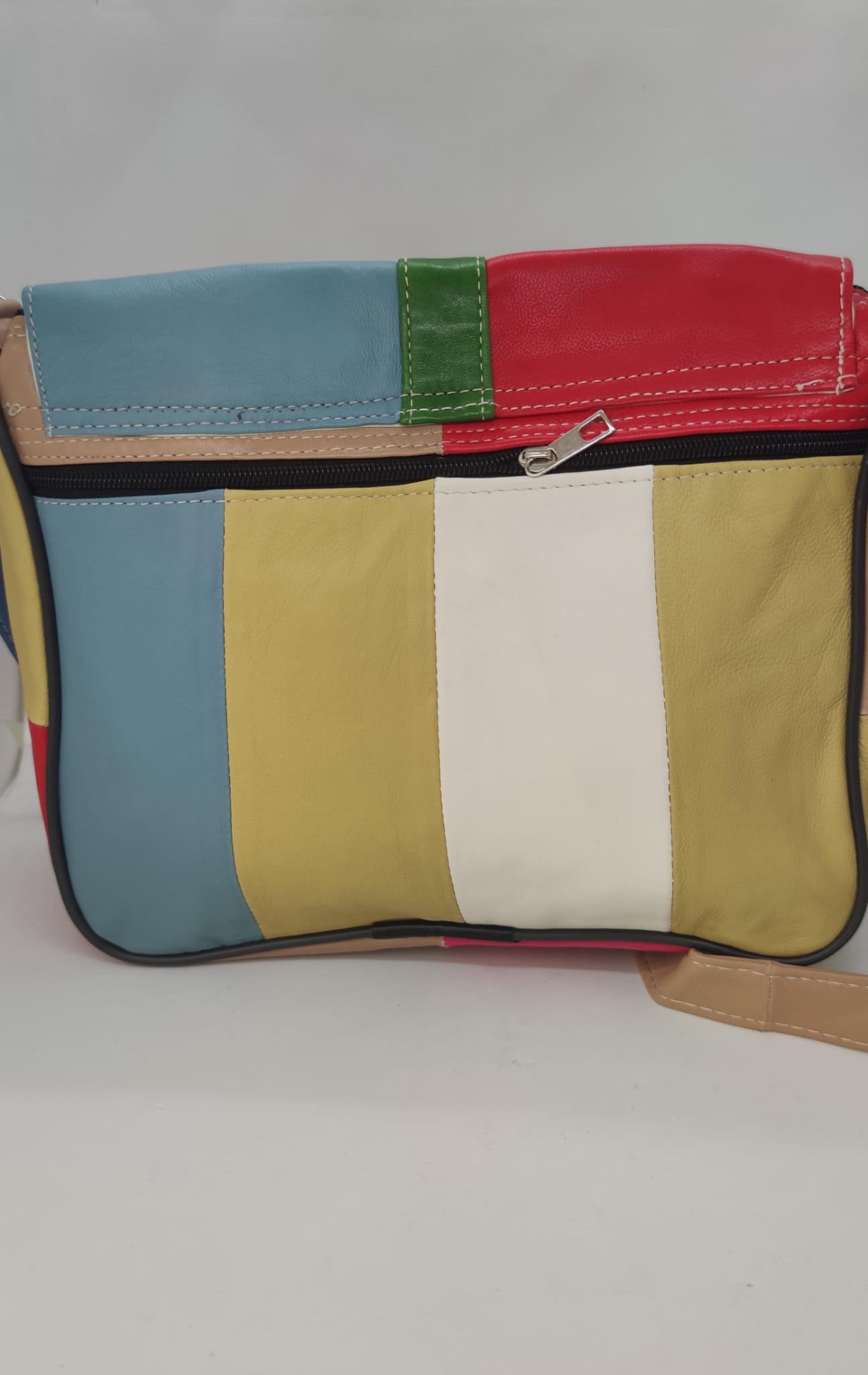Farklı renklerin bir araya geldiği özgün patchwork tasarımıyla dikkat çeken bu hakiki deri kadın çanta, stilinde fark yaratmak isteyenler için tasarlandı. Her parçası kendine özgü görünümüyle sıradan çantalardan ayrılır.