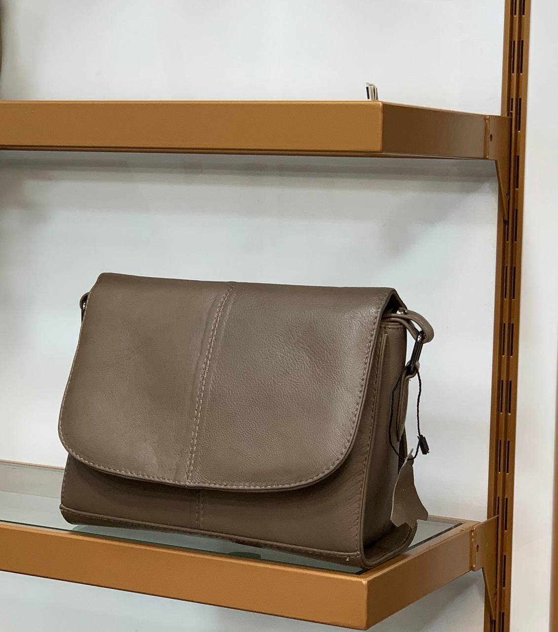 Hakiki deri kadın omuz çantası, vizon rengi ile sade ama sofistike bir görünüm sunar. Kapaklı tasarımı sayesinde klasik ve şık bir stil oluşturur.