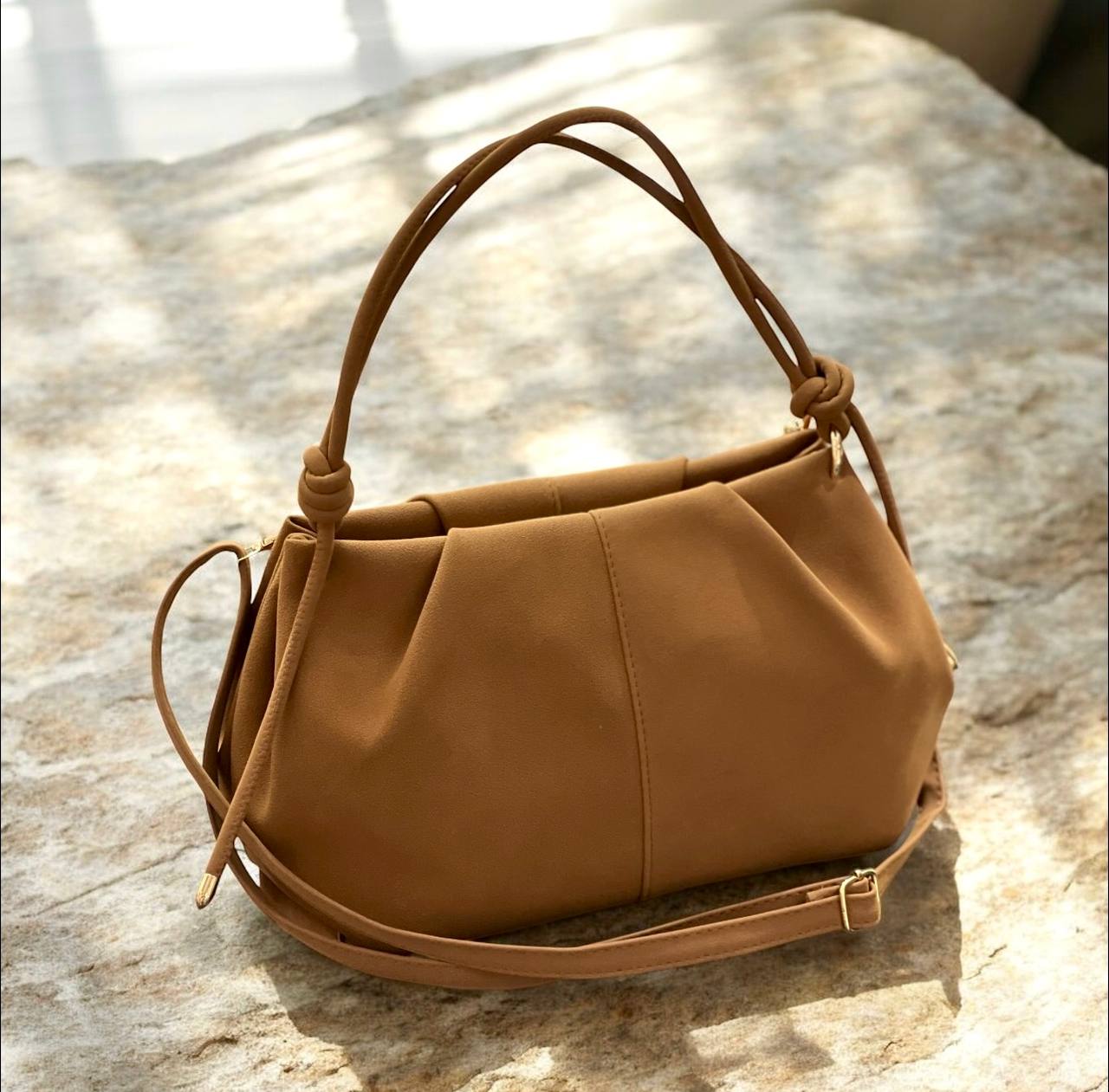 Süet kadın omuz çantası, yumuşak dokusu ve doğal görünümü ile kombinlerinize sıcak ve şık bir hava katar. Taba tonu sayesinde hem klasik hem modern kombinlerle kolayca uyum sağlar.